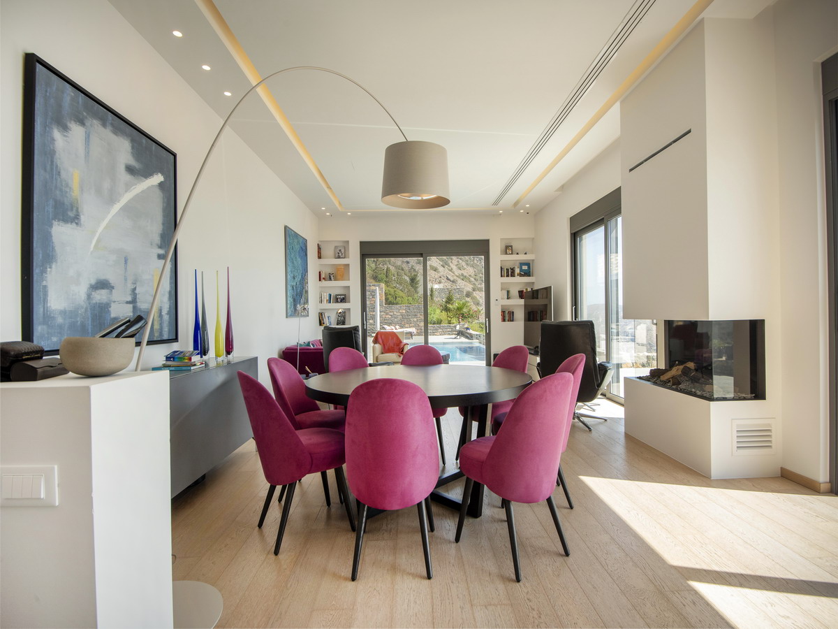 The upper floor hosts a bright, open-plan living and dining area with a cozy fireplace, alongside a fully fitted kitchen with premium Miele, Bosch, and LG appliances. A guest WC is also located on this level. Large glass doors open onto the main terrace and swimming pool, seamlessly blending indoor and outdoor living.