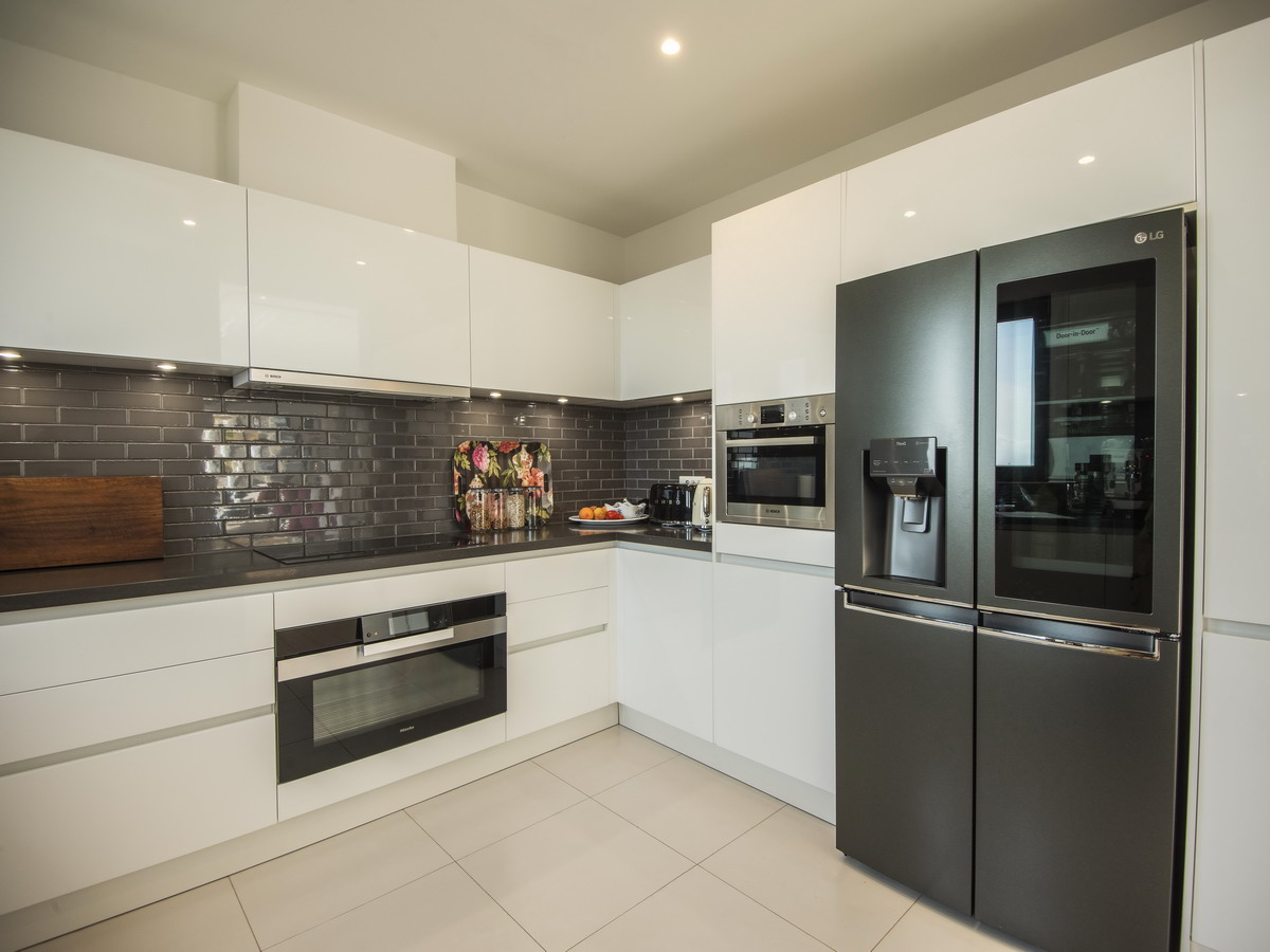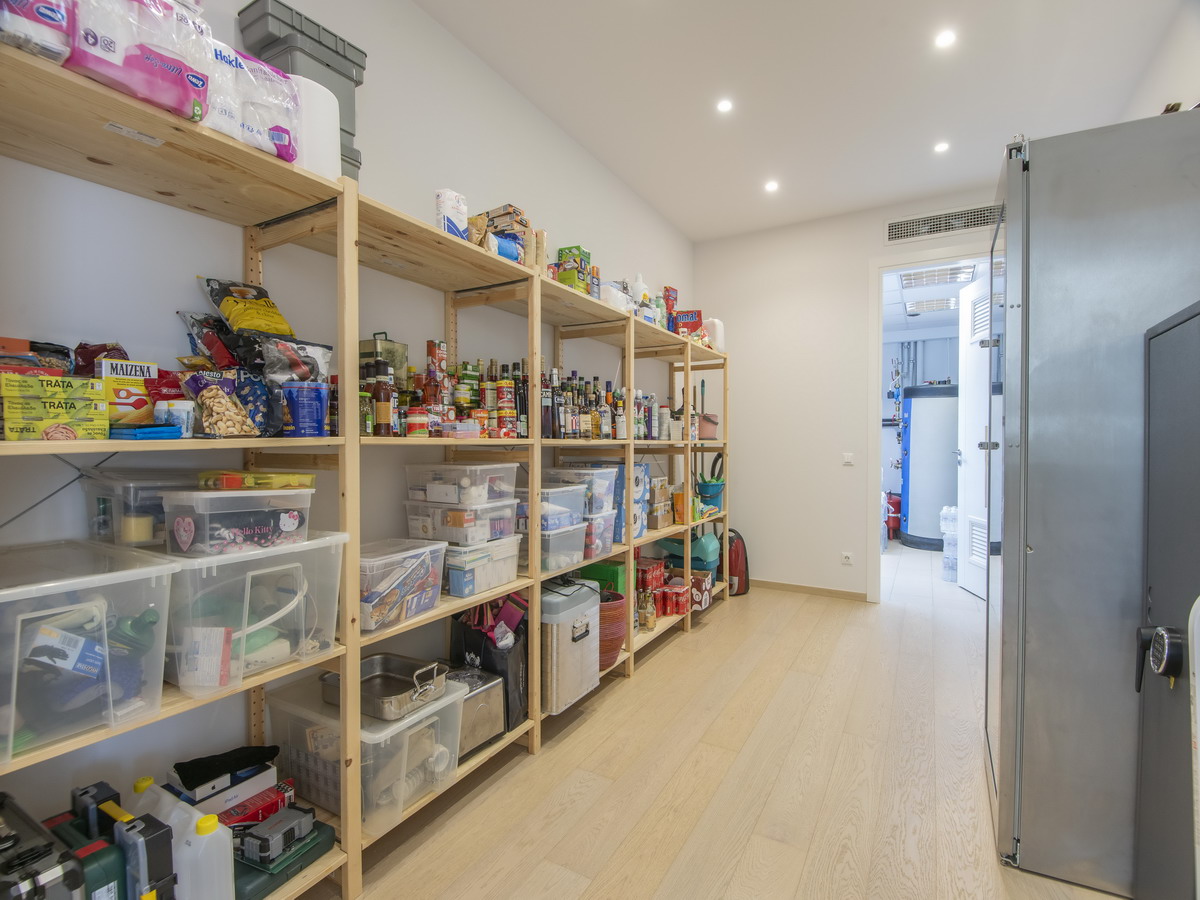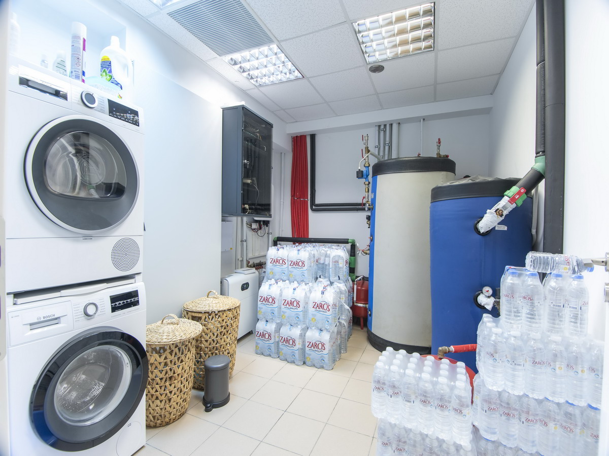 On the lower floor, you’ll find the spacious master bedroom complete with a walk-in wardrobe and en-suite bathroom, as well as three additional double bedrooms, each with its own en-suite. This level also includes a storage room with wine cooler and extra fridge-freezer, plus a technical and laundry area equipped with Bosch washer and dryer.