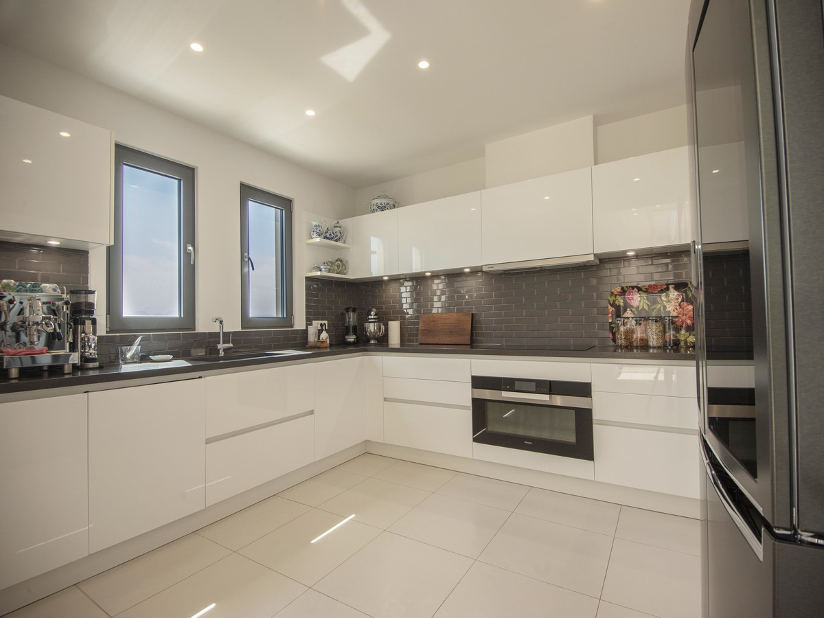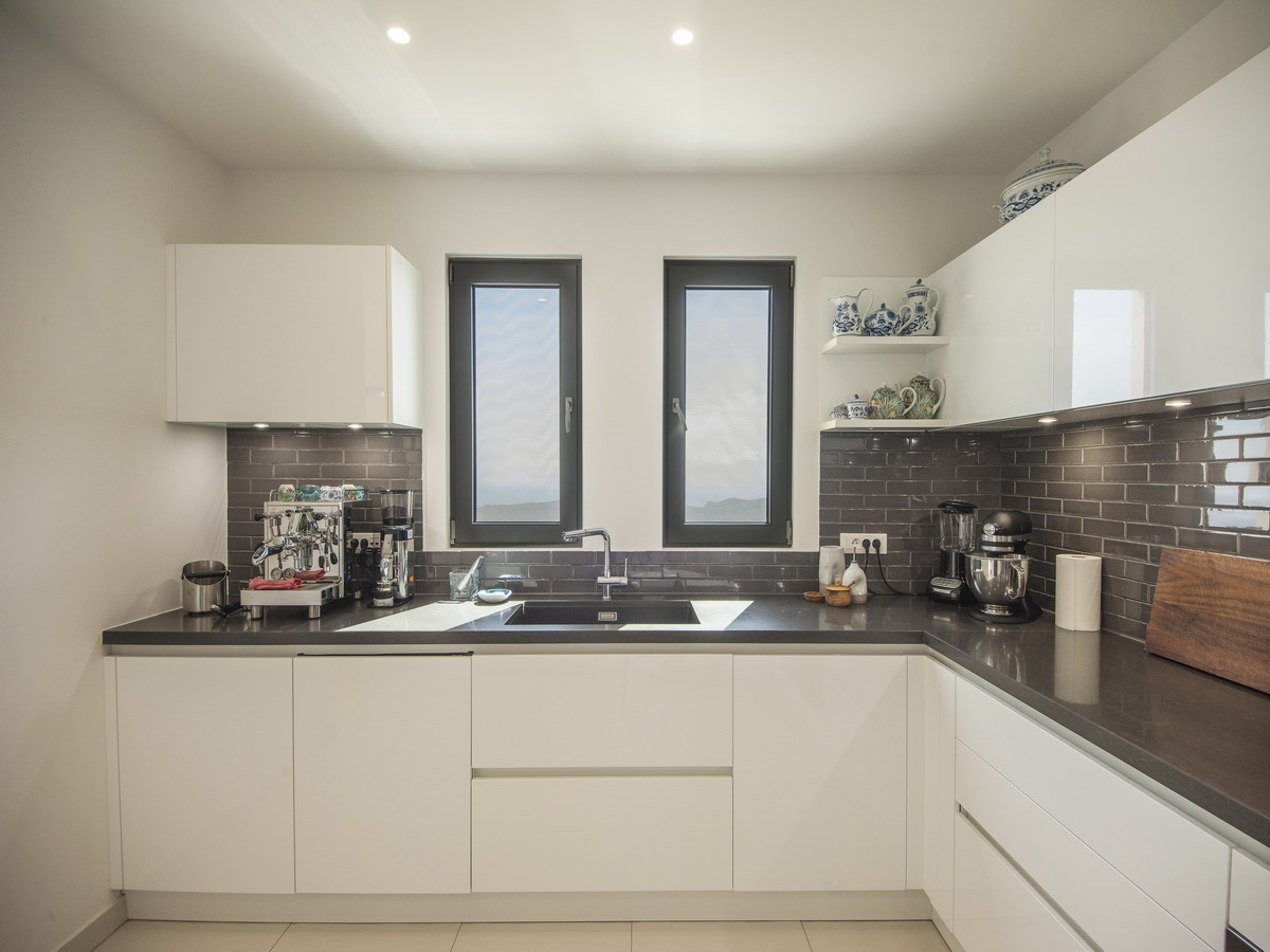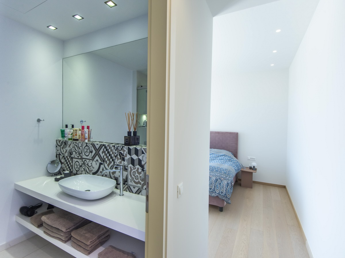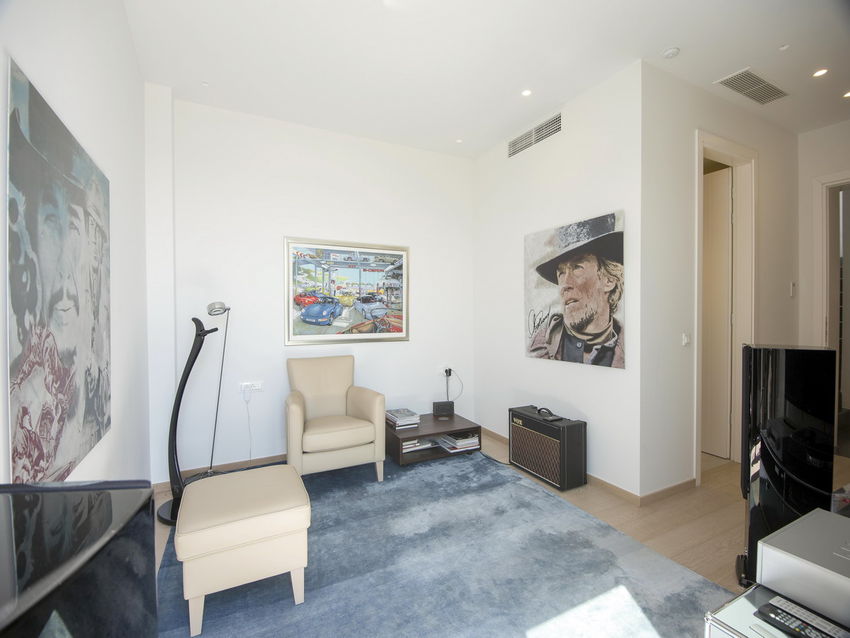 On the lower floor, you’ll find the spacious master bedroom complete with a walk-in wardrobe and en-suite bathroom, as well as three additional double bedrooms, each with its own en-suite. This level also includes a storage room with wine cooler and extra fridge-freezer, plus a technical and laundry area equipped with Bosch washer and dryer.
