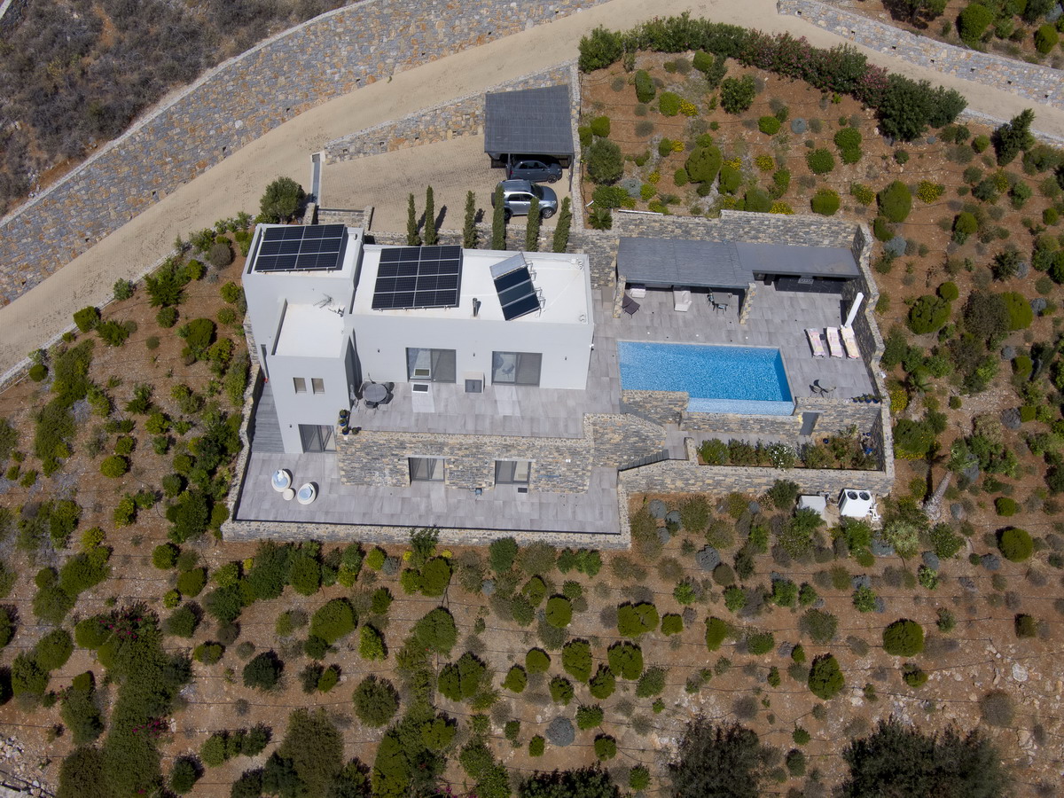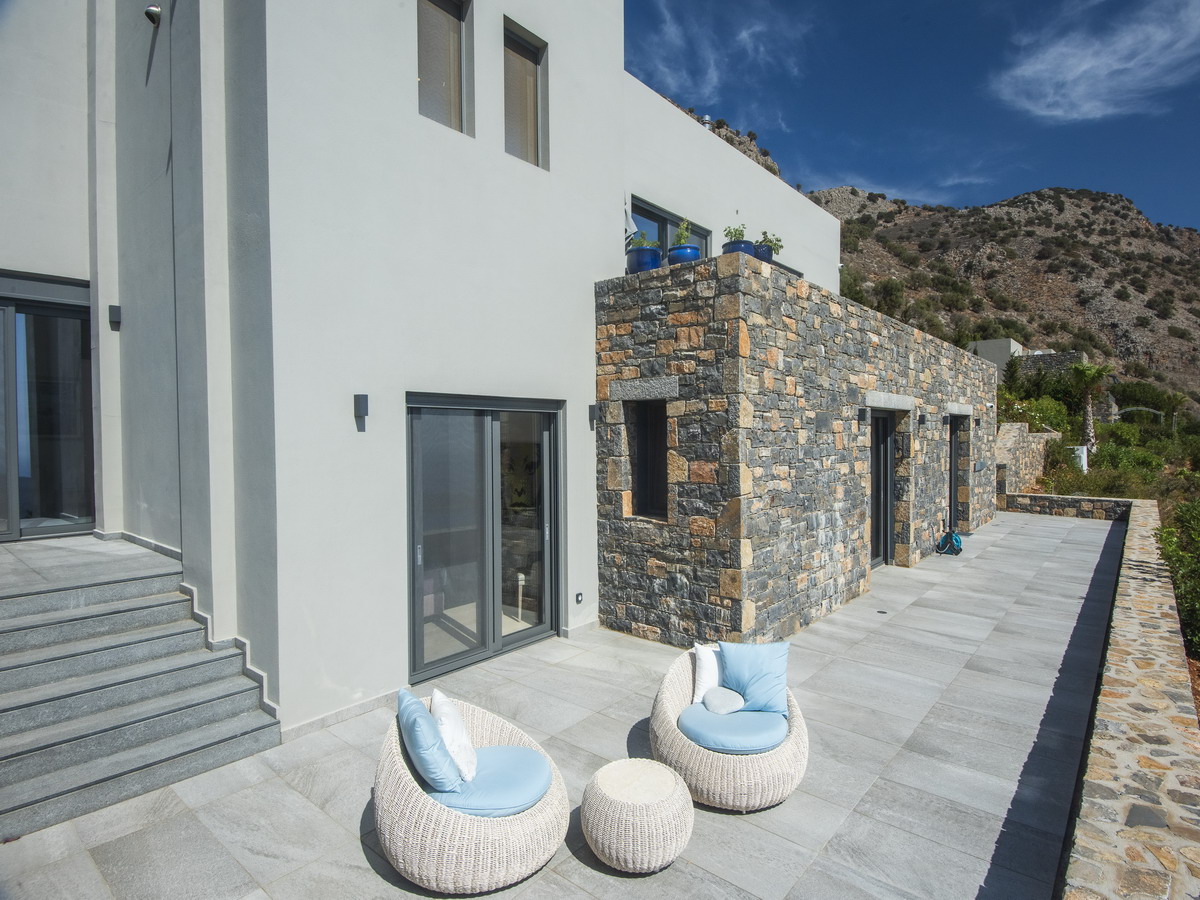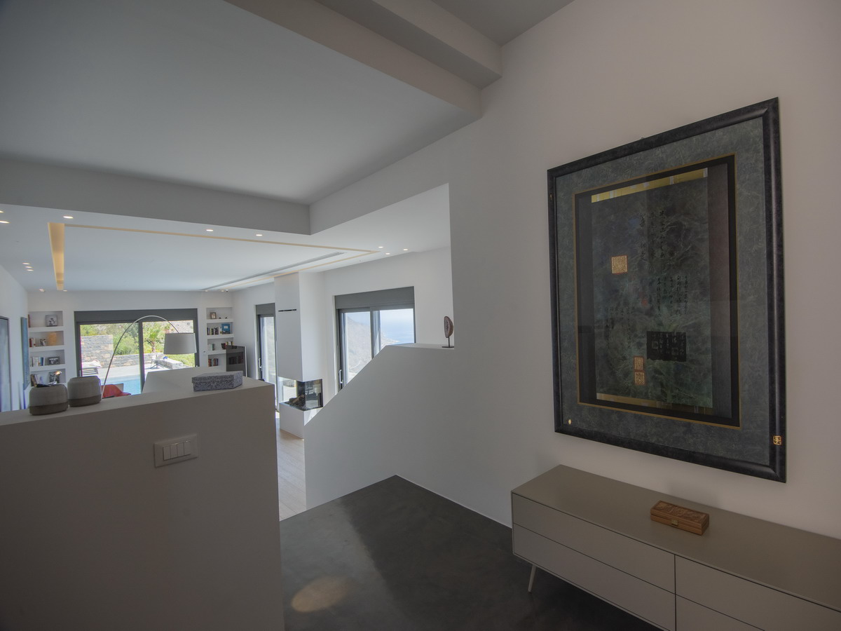 A wide terrace runs along the entire façade, offering captivating sea and island views and connecting to the pool via an exterior staircase.