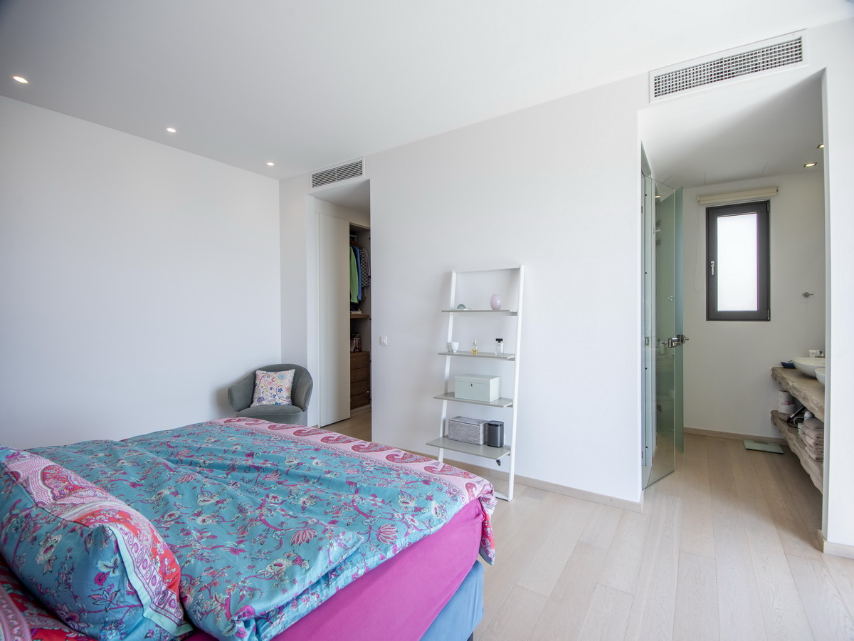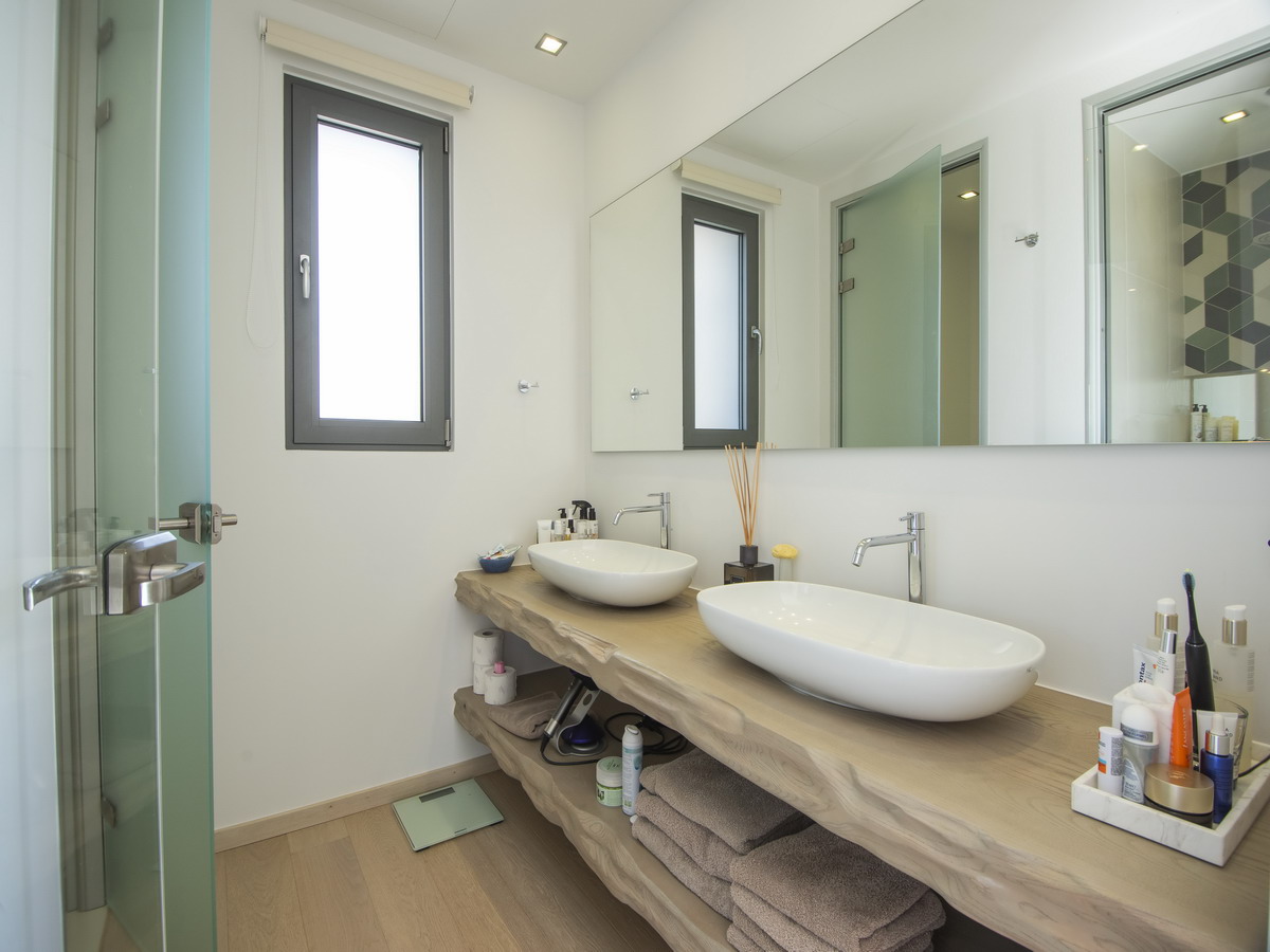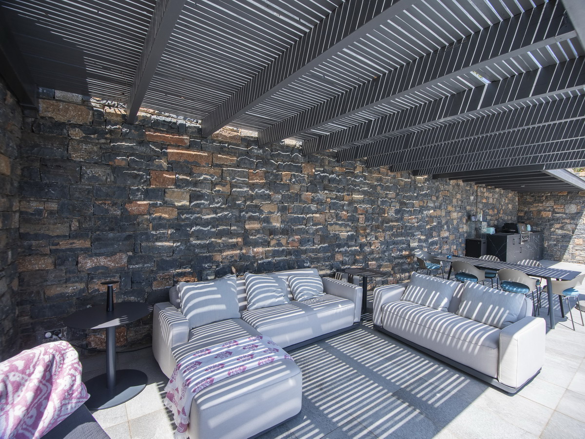 A wide terrace runs along the entire façade, offering captivating sea and island views and connecting to the pool via an exterior staircase.