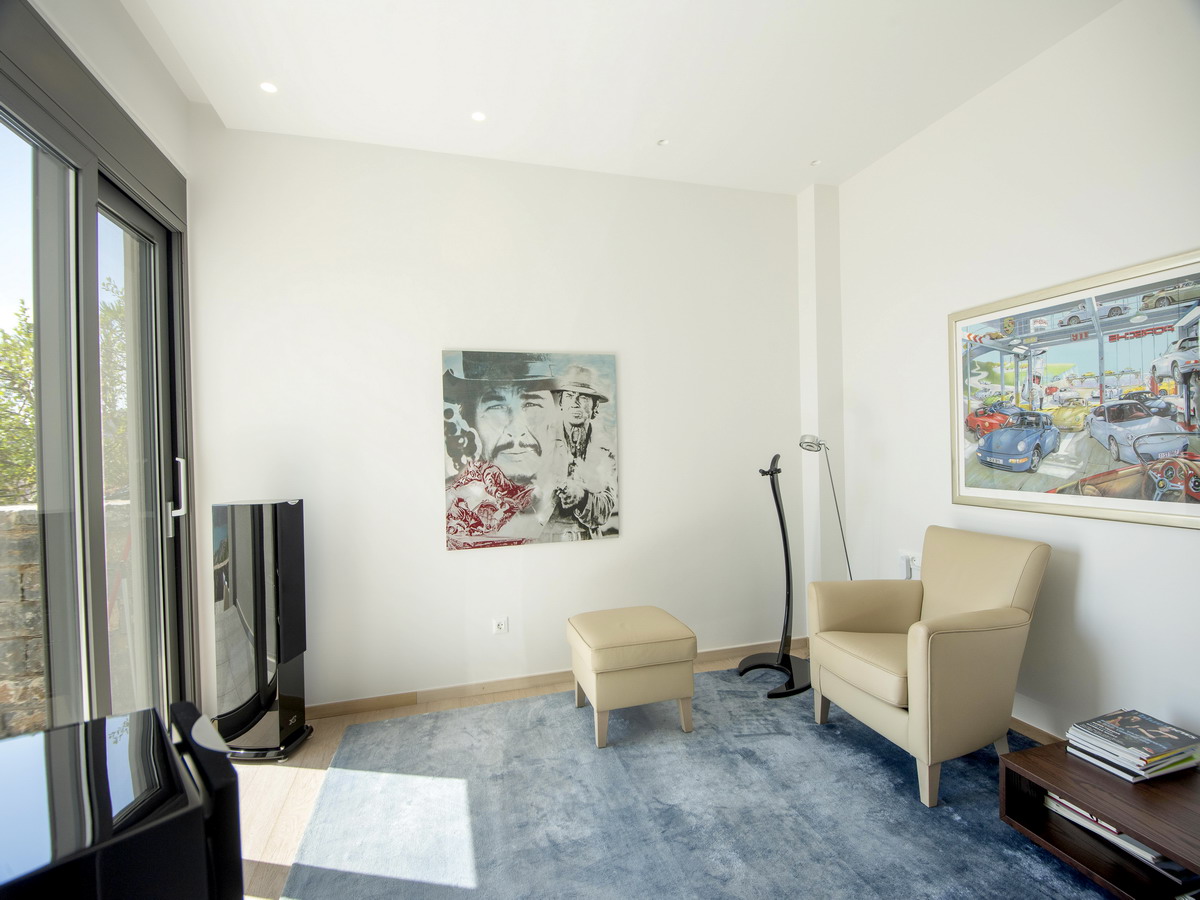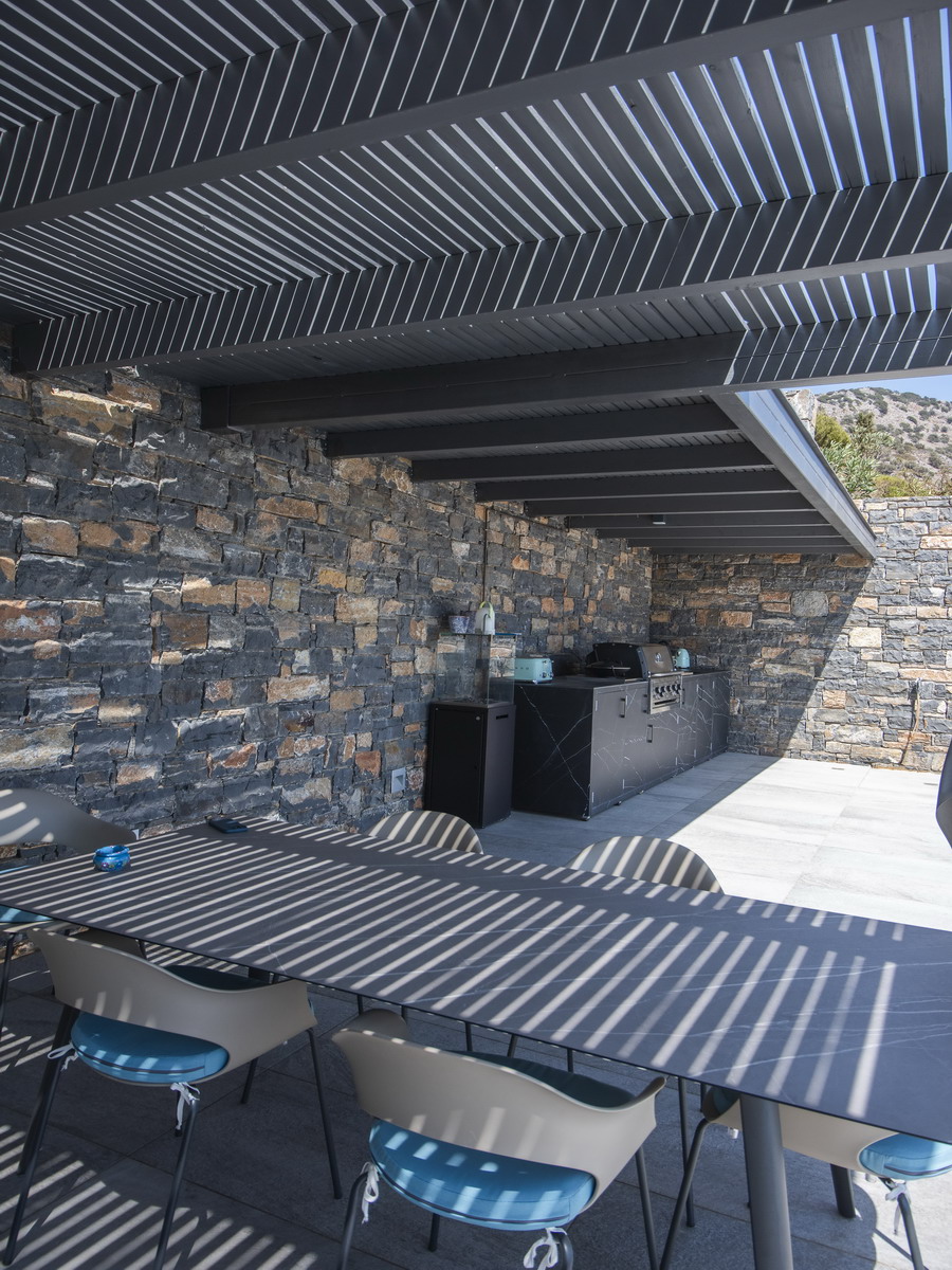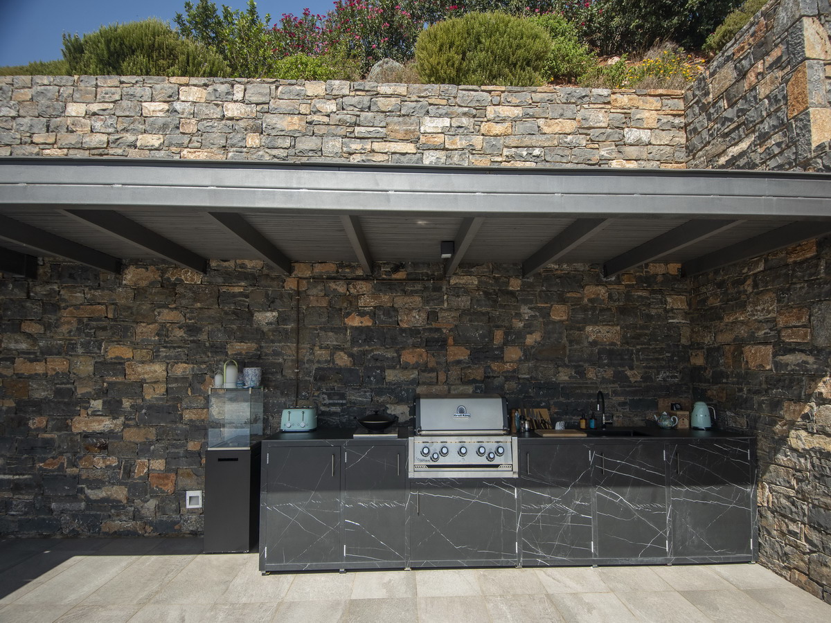 The villa’s exterior has been designed for relaxation and entertaining. The 47 m² heated pool (powered by a heat pump) is accompanied by a fully equipped outdoor kitchen and BBQ area with fridge, sink, stove, and gas grill. The landscaped gardens are lush with mature plants, flowers, and herbs, creating a beautiful Mediterranean atmosphere.
